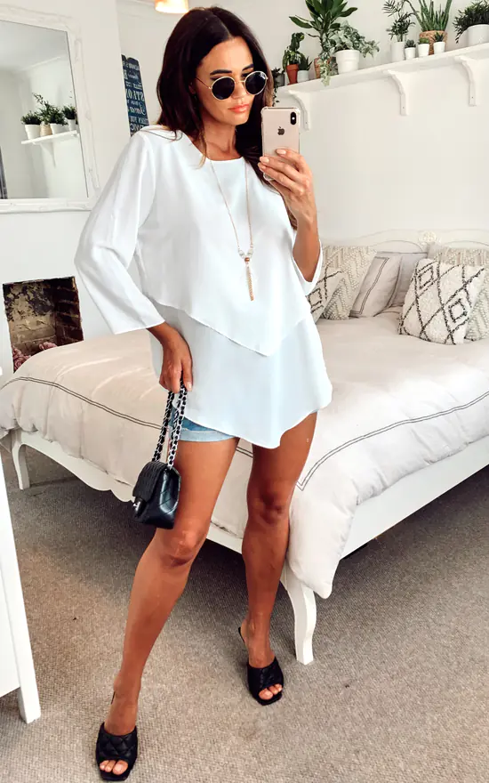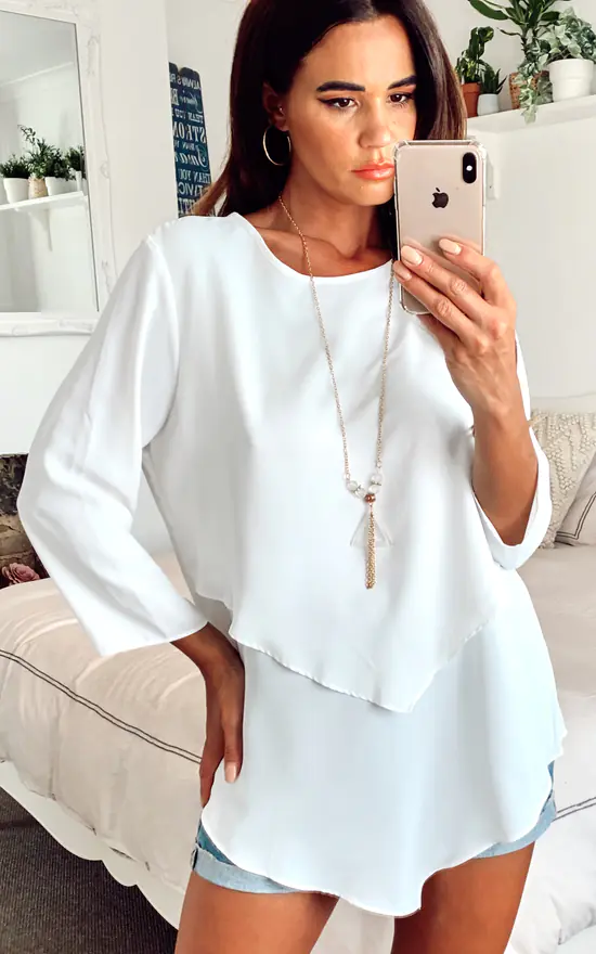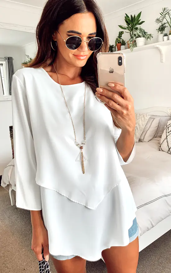 3/4 Sleeve Relaxed Layered Top with Necklace In White