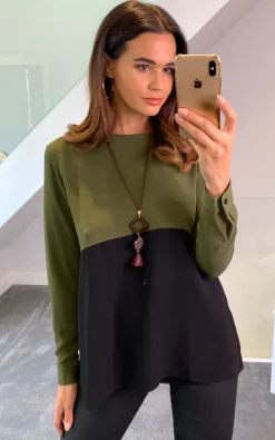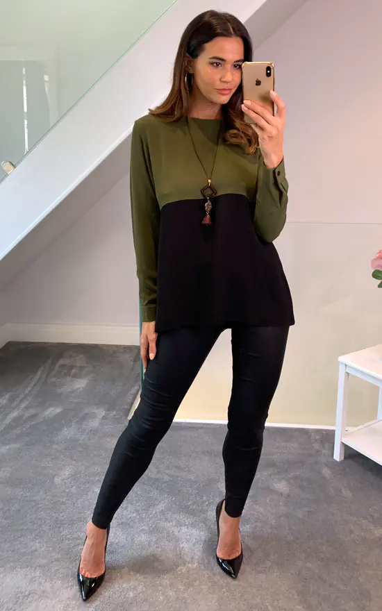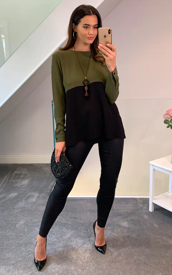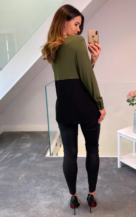 Colour Block Blouse in Khaki and Black is a very stylish piece with color transitions! With this piece that you can use comfortably every season, you can comfortably combine it with a denim shorts in Summer evenings and jeans in other seasons!