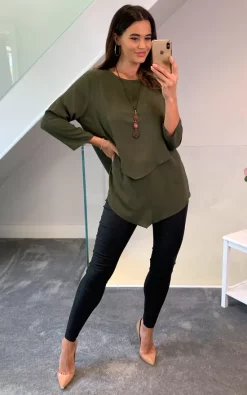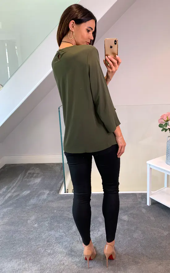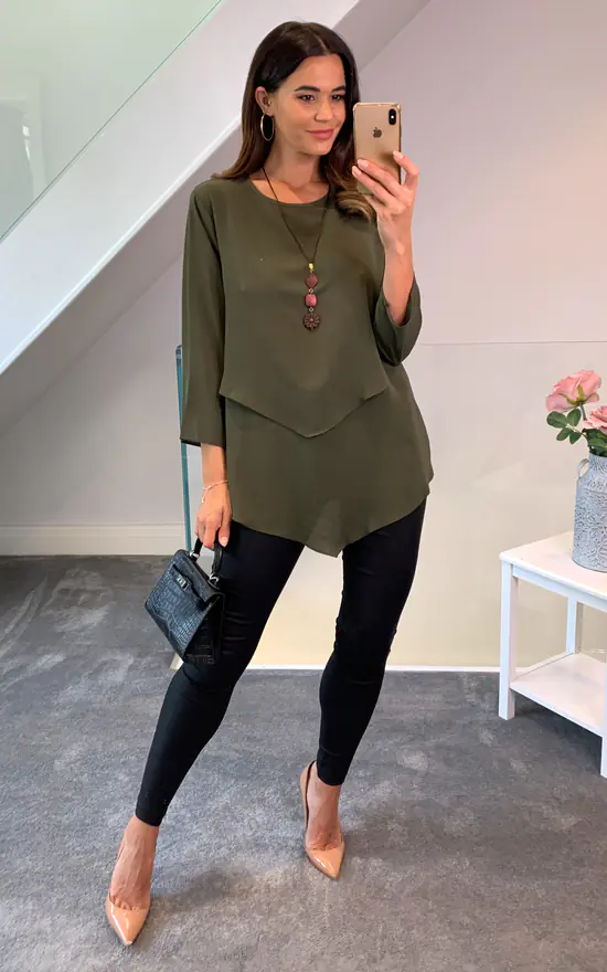 3/4 Sleeves Relaxed Layered Top in Khaki perfectly fits for workplace and also classy piece for night outs, you can easily combine with basic jeans and tights. You can complete your look with basic necklace!