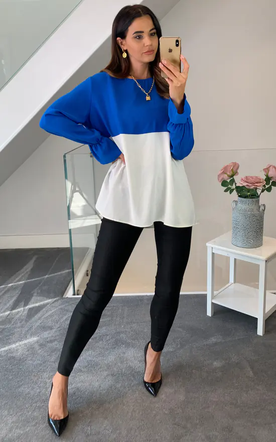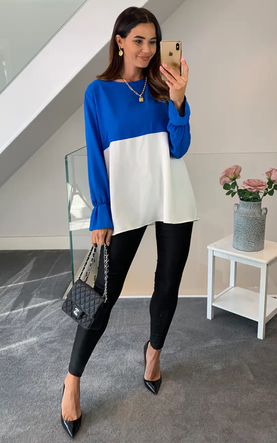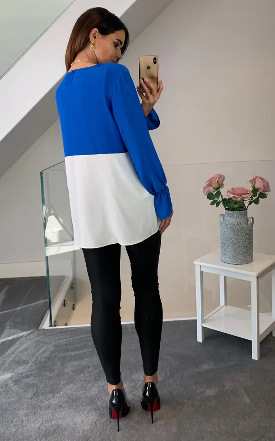 Long Sleeve Relaxed Fit Block Top with Necklace In Blue and White is must have piece. Comfy fabric makes it wearable on spring day. You can choose this one for busy workday. It can easily combine different color pants and a classy hat!