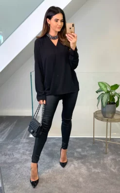 Long Sleeves Oversized Top with Pearl Detail Collar in Black is lovely comfy oversized fit, it’ll keep you comfortable wherever you go: from lounging on the sofa to going out for coffee!