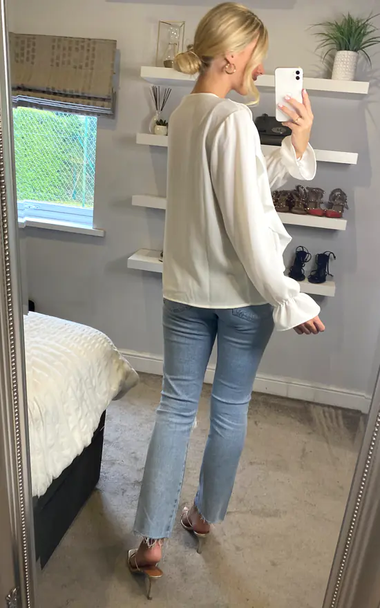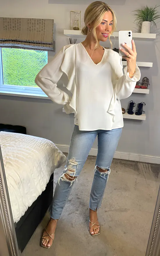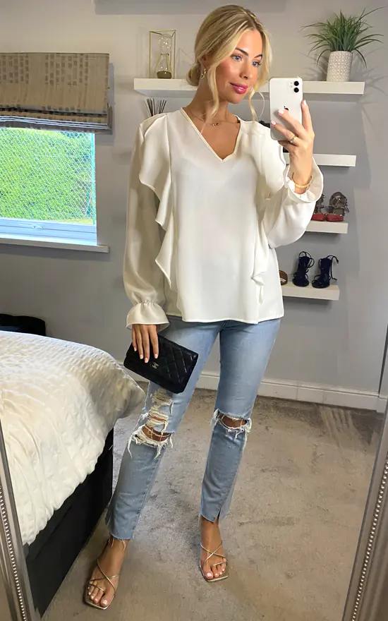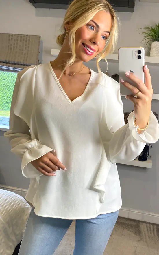 So easy to wear, you can match this Long Sleeves V Neck Detailed Frilled Front Top in White with your favourite high heeled sandals and go on a date with your Officemates!