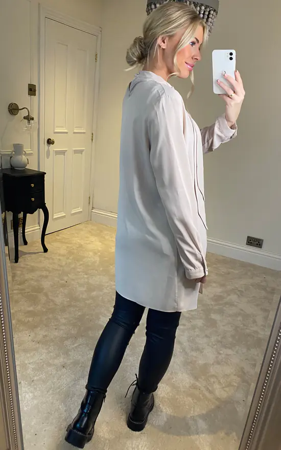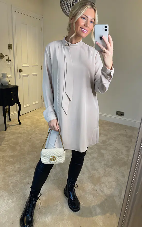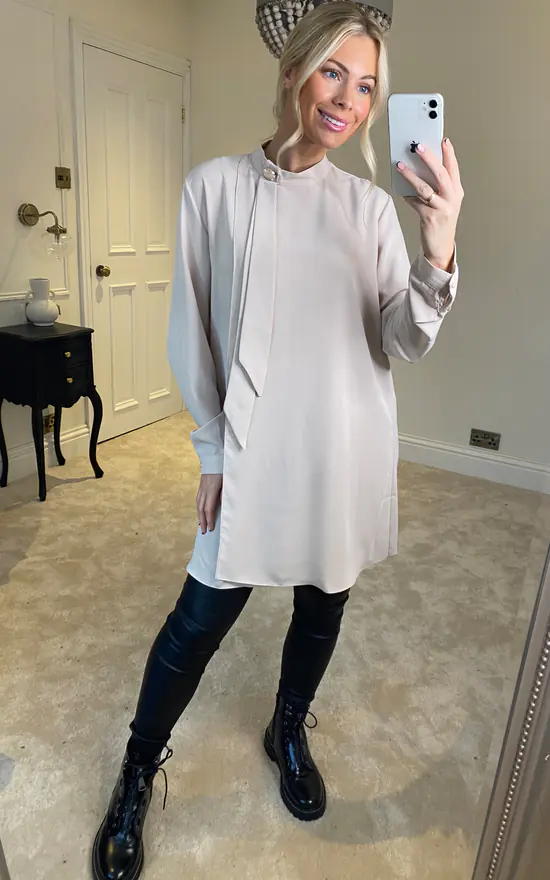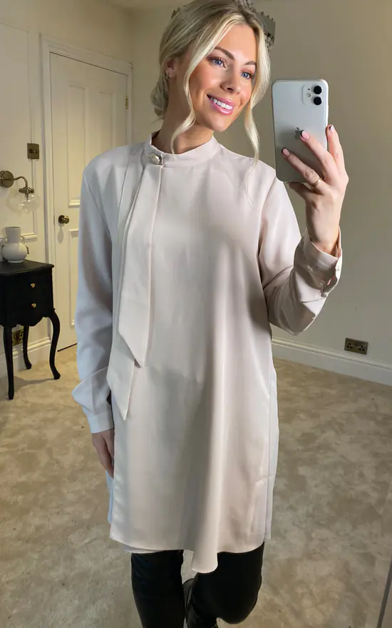 Oversized Brooch Detailed Long Sleeves Tunic Top in Beige is the perfect addition to your wardrobe. It features a button details, long sleeves, and an oversized fit that is sure to turn heads!