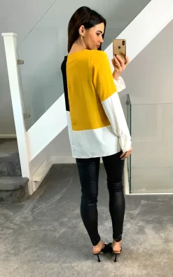 Oversized Colour Block Blouse in Yellow and Black with cute color transitions takes you out from monotone, regular look. You can feel very comfy with this piece in long days. It can be combined with jeans and basic shoes. A nice and simple necklace could be finishing touch on this combine!