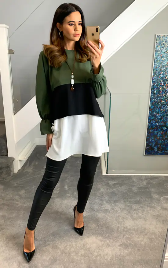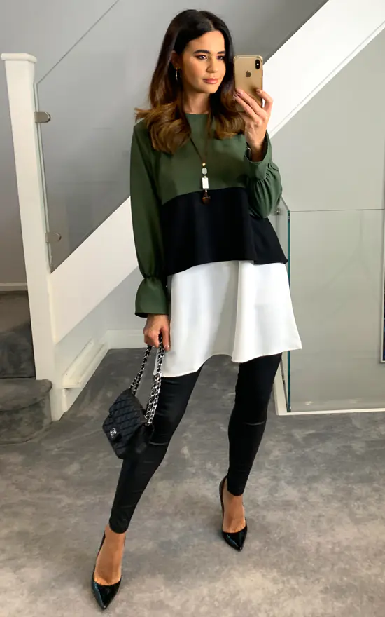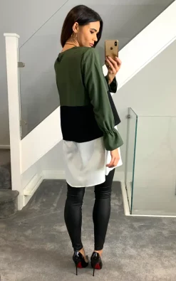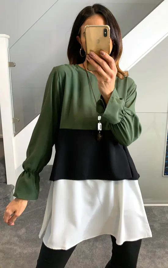 Oversized Colour Block Top in Khaki, Black and White’s cute color transitions takes you out from monotone, regular look. You can feel very comfy with this piece in long days. It can be combined with jeans and basic shoes.