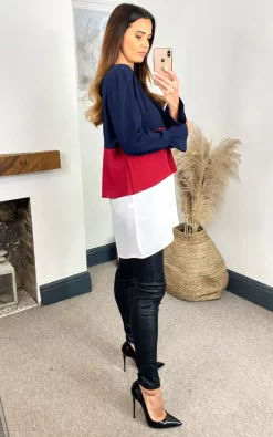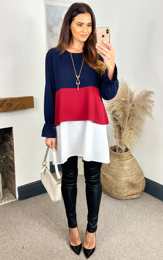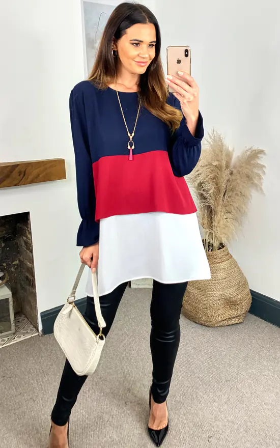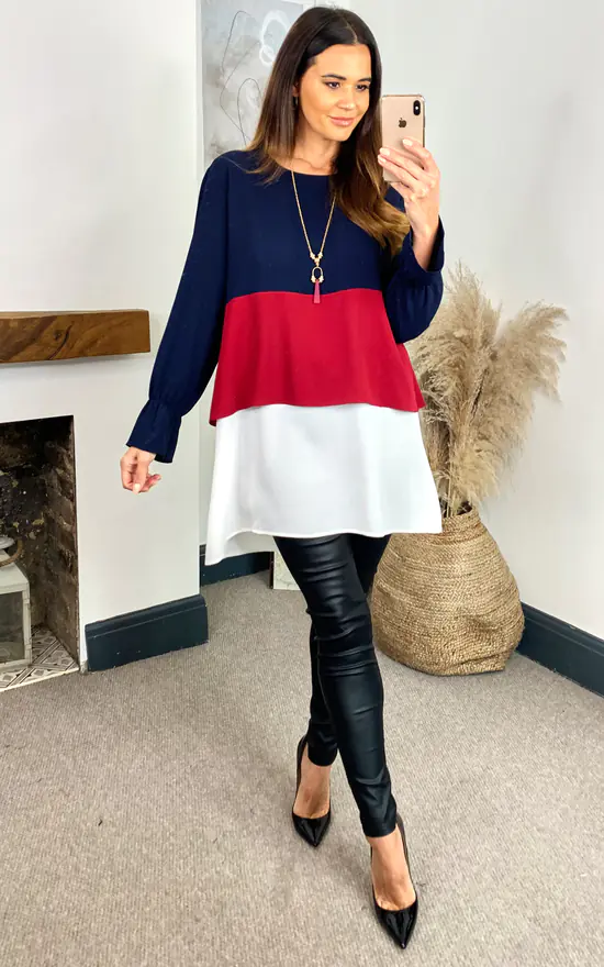Oversized Colour Block Top in Navy, Red and White with Necklace