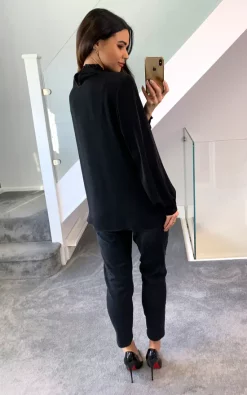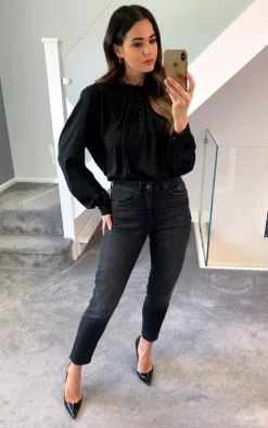 This will be certainly your favorite shirt with itβs frill neck details in your closet. You can comfortably match it with denim skirts in autumn days.