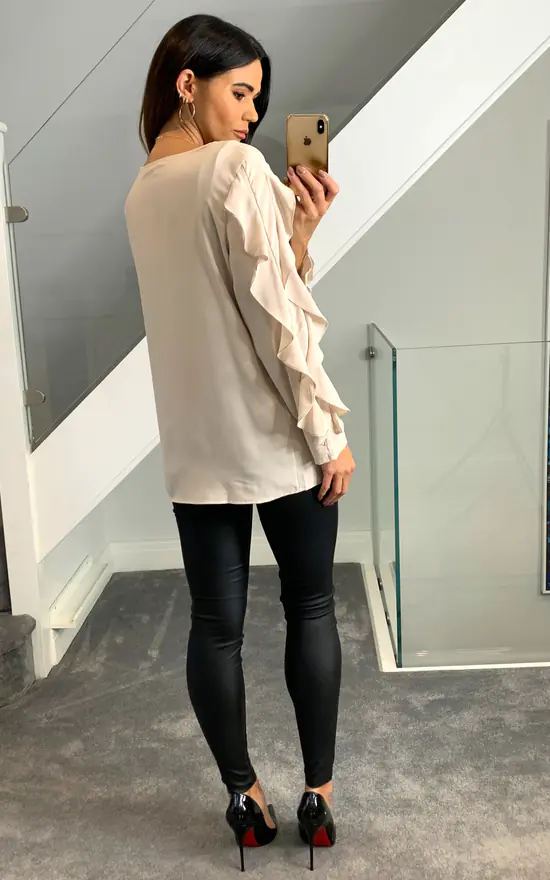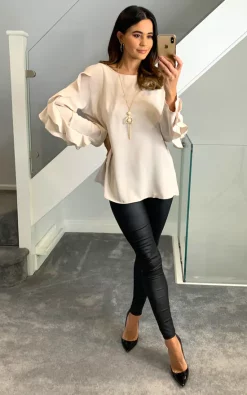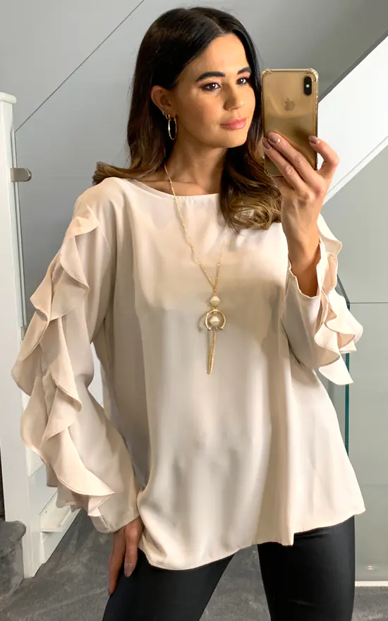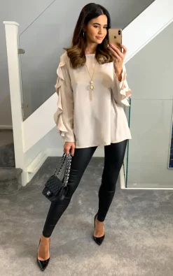 You can feel very comfy with Oversized Ruffle Sleeves Relaxed Fit Top in Cream in long days. It can be combined with jeans and basic shoes. A nice and simple necklace could be finishing touch on this combine!