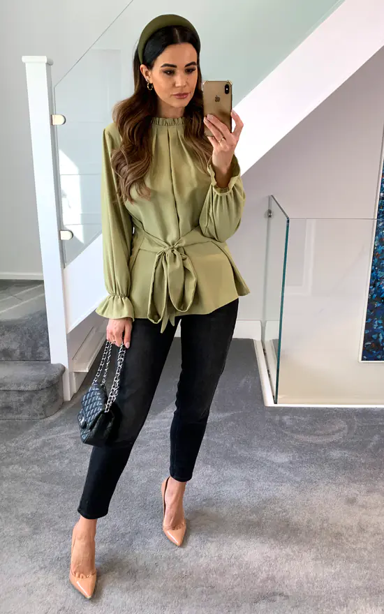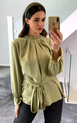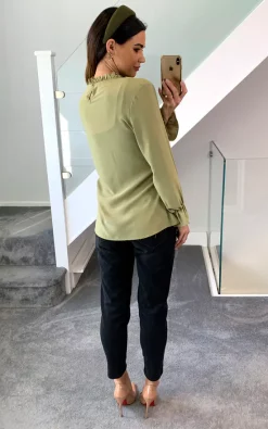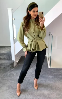 Oversized Tie Ruffle Neck with Tie Waist Detailed Top in Sea Green is a must have piece in Spring and Summer season!