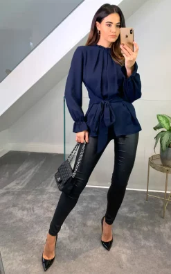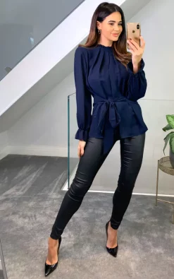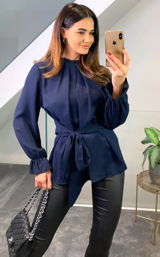 Oversized Tie Ruffle Neck with Tie Waist Detailed Top in Navy is a must have piece in Spring/Summer season!