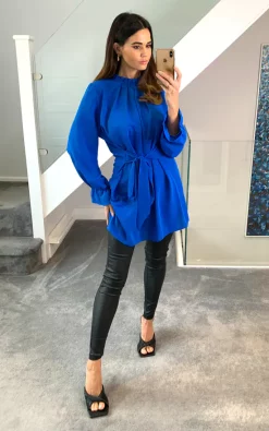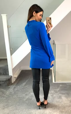Oversized Tie Ruffle Neck with Tie Waist Detailed Tunic in Blue is a must have piece in Autumn/Winter season! It can be worn whenever and wherever you want!