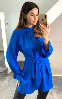 Oversized Tie Ruffle Neck with Tie Waist Detailed Tunic in Blue is a must have piece in Autumn/Winter season! It can be worn whenever and wherever you want!