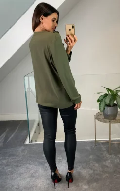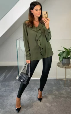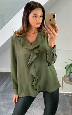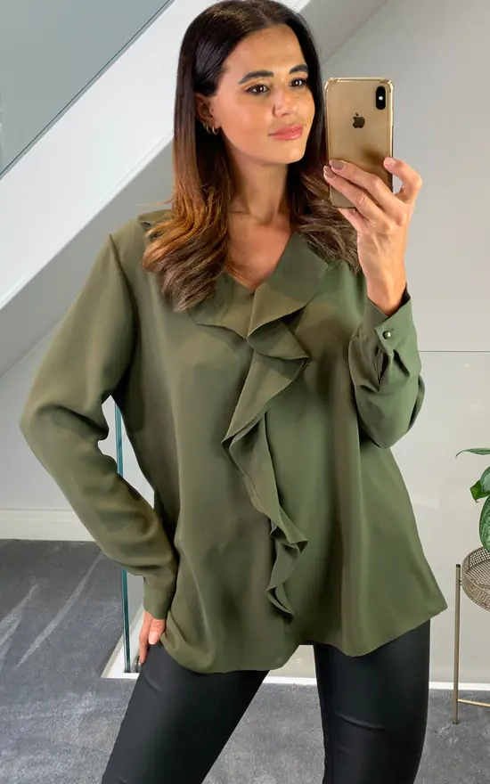 Oversized Top with Frilled Front in Khaki
