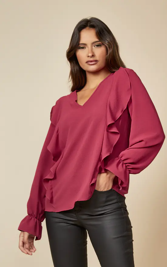Oversized V Neck Top Ruffle Front Details in Burgundy is a must-have piece that can be combined in different ways. This is the ultimate go-to top in your wardrobe. This blouse is your savior for date nights, family gatherings, work, and going outs!