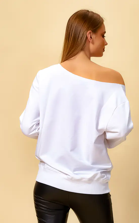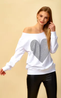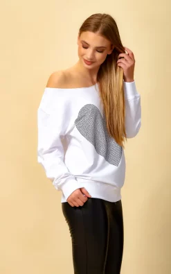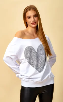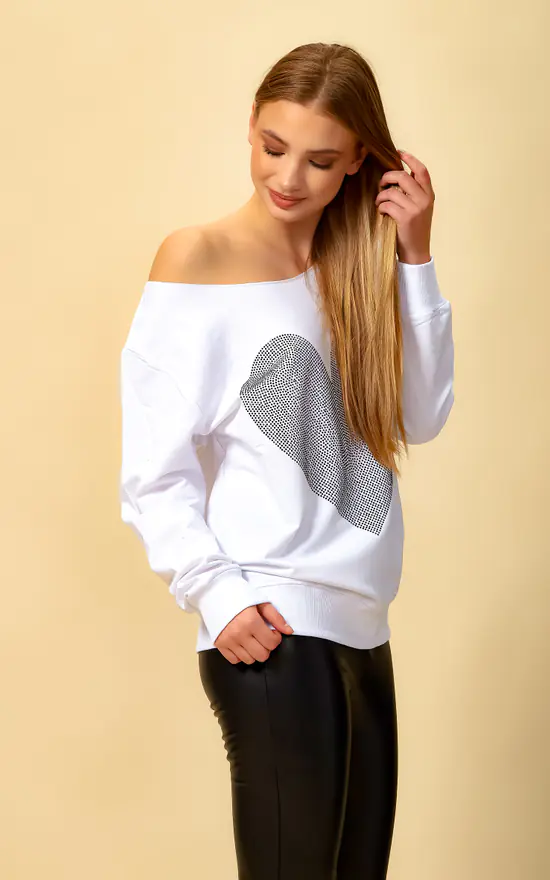 Oversized Heart Sweatshirt with Boat Neckline in White can be combined with jeans and basic shoes. A nice and simple scarf and hat could be finishing touch on this combine!
