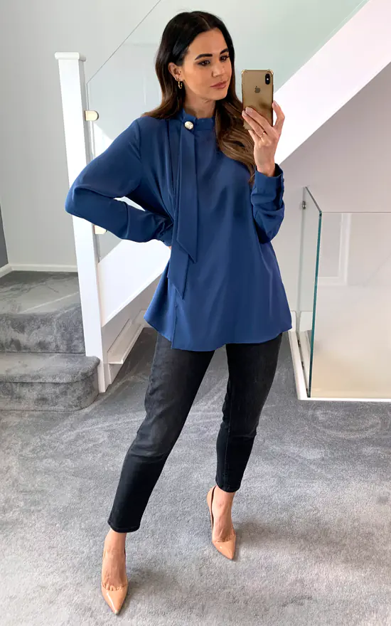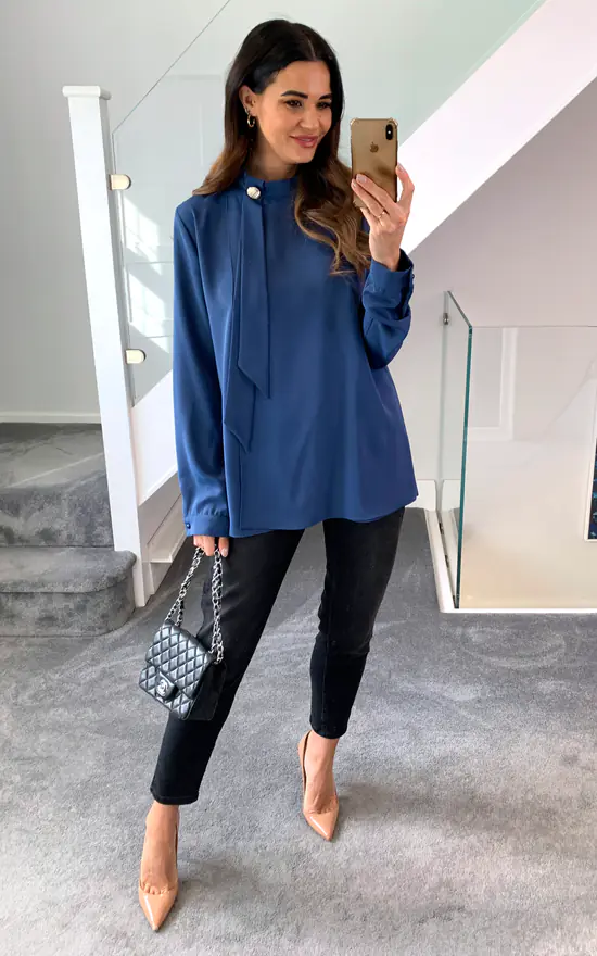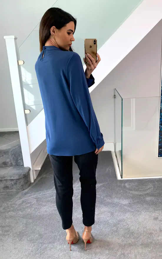 Oversized High Neck Top with Brooch Details in Indigo perfectly fits for workplace and also classy piece for night outs, you can easily combine with basic jeans and tights. You can complete your look with basic necklace!