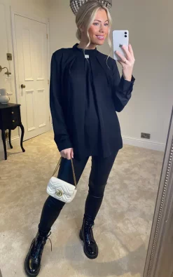 Oversized Long Sleeves Brooch Detailed Top in Black perfectly fits for workplace and also classy piece for night outs, you can easily combine with basic jeans and tights. You can complete your look with cute earrings!