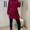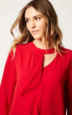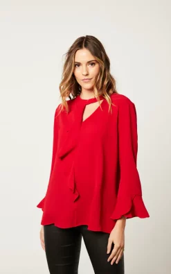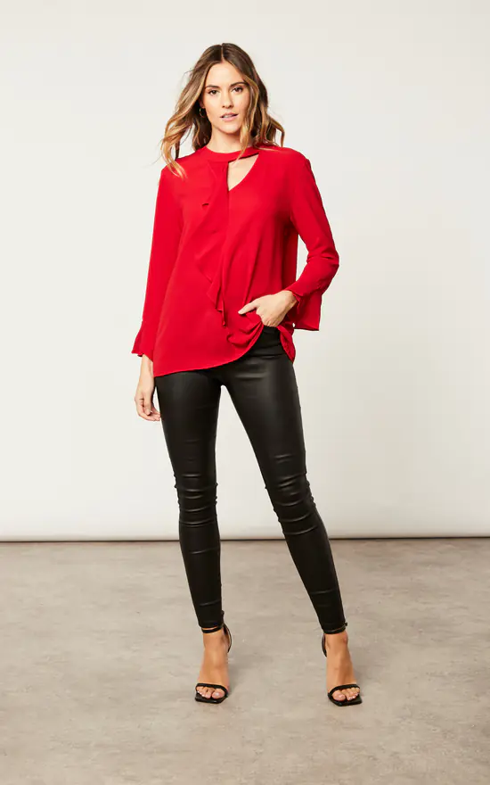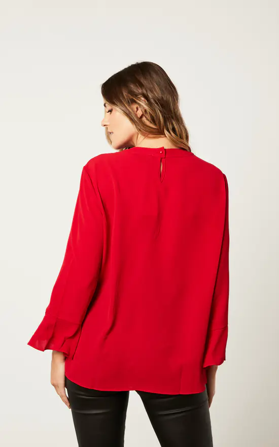 Oversized Long Sleeves Frill Front Blouse with Detailed Neckline in Red is your new go-to for a sophisticated look. The detailed neckline and the frilled sleeves give this blouse a refined style that pairs well with any of your favorite outfits.
