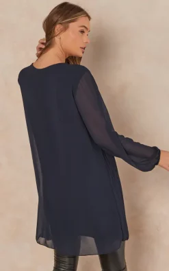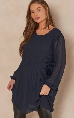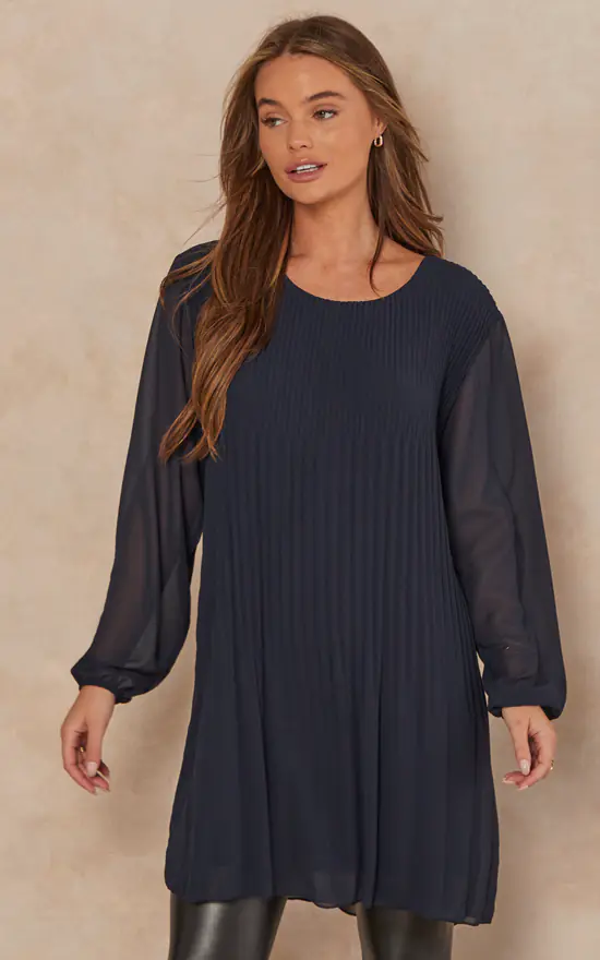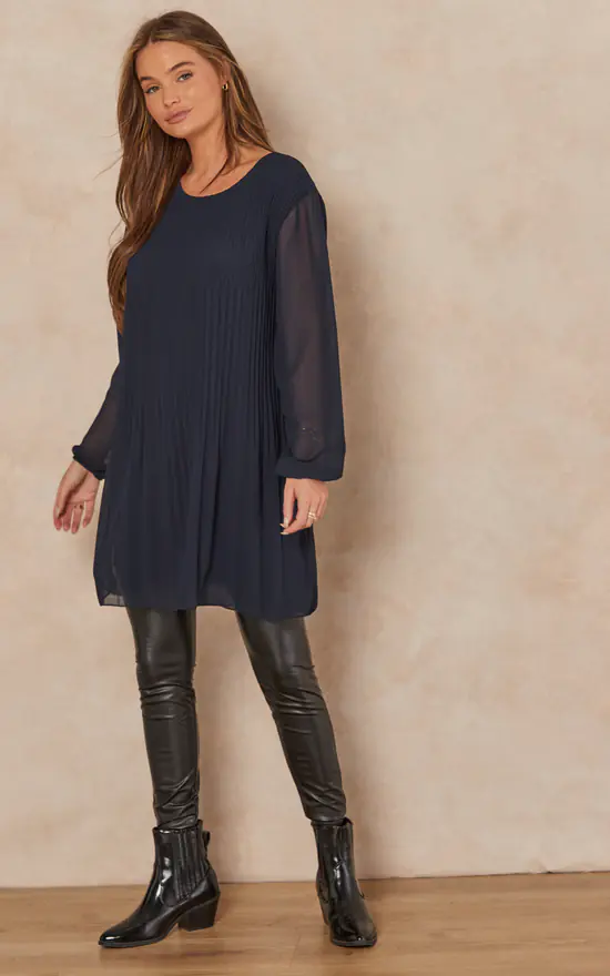 This Oversized Long Sleeves Pleated Tunic with Necklace in Navy is the perfect piece for your fall wardrobe. It’s a stylish way to keep warm, and it pairs well with jeans or leggings for a perfect look!