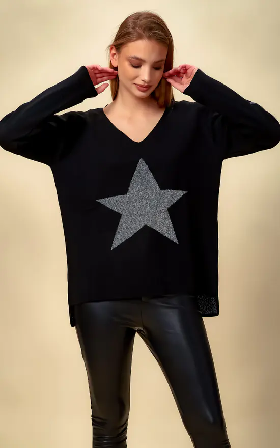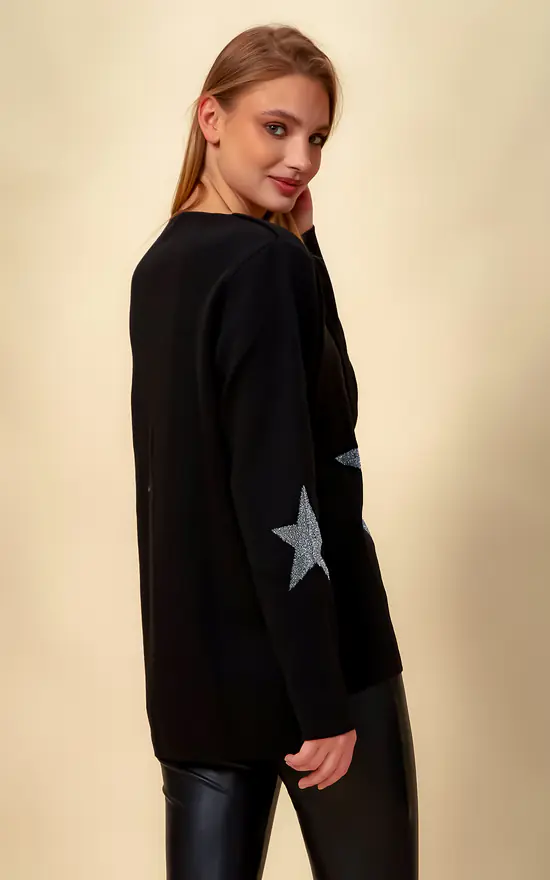 Oversized Long Sleeves Star Top with V Neck in Black can be combined with jeans and basic shoes. A nice and simple necklace could be finishing touch on this combine!