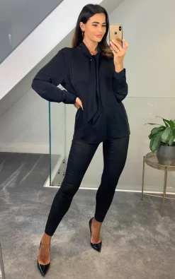 Oversized Long Sleeves Tie Neck Top in Black is very fashionable way for throw on and go! Its oversized form makes you comfy at work plus it can be very elegant for after work drinks!