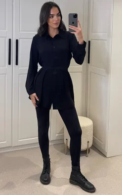 Oversized Long Slevees Pleated Shirt Top with Matching Belt in Black is the perfect choice to dress up your wardrobe! The belt detail adds a little something special to an otherwise basic shirt. The long sleeves keep you cozy and warm during the chilly winter months!