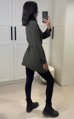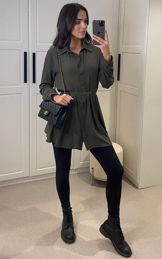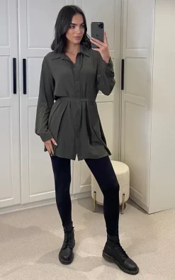 Oversized Long Slevees Pleated Shirt Top with Matching Belt in Khaki is the perfect choice to dress up your wardrobe! The belt detail adds a little something special to an otherwise basic shirt. The long sleeves keep you cozy and warm during the chilly winter months!