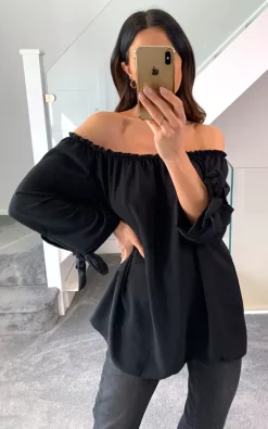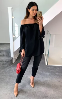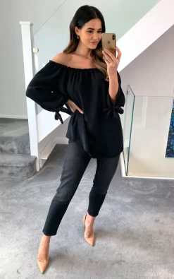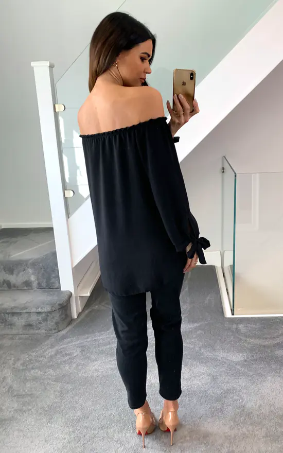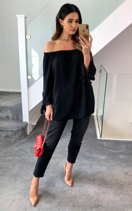 Oversized Off Shoulder Top with Tie Detailed Sleeves in Black can be combined with jeans and basic sandals. A nice and simple earings could be finishing touch on this combine!