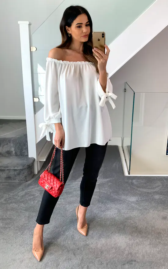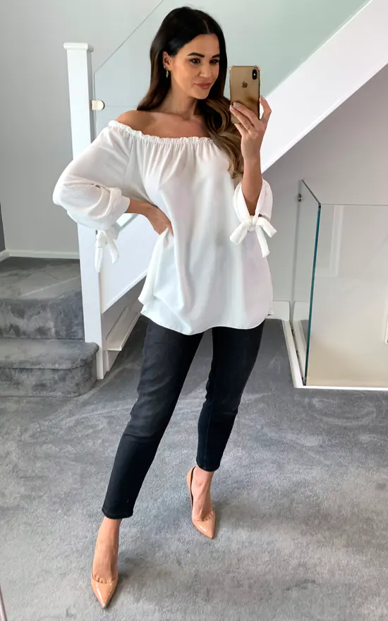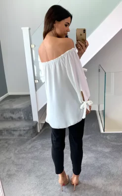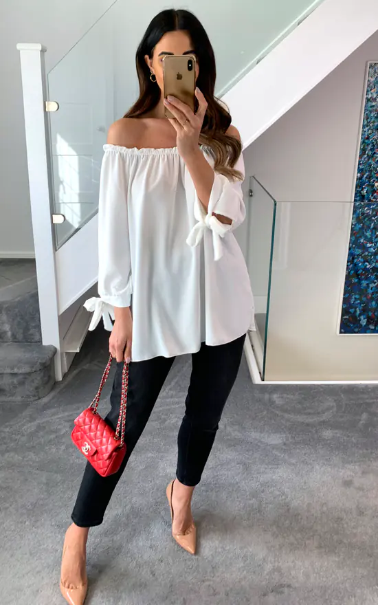 Oversized Off Shoulder Top with Tie Detailed Sleeves in White can be combined with jeans and basic sandals. A nice and simple earings could be finishing touch on this combine!