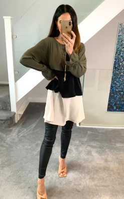 Oversized Relaxed Fit Colour Block Top Khaki, Black and Cream with cute color transitions takes you out from monotone, regular look. You can feel very comfy with this piece in long days. It can be combined with jeans and basic shoes. A nice and simple necklace could be finishing touch on this combine!