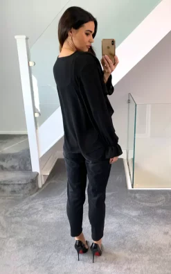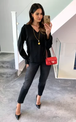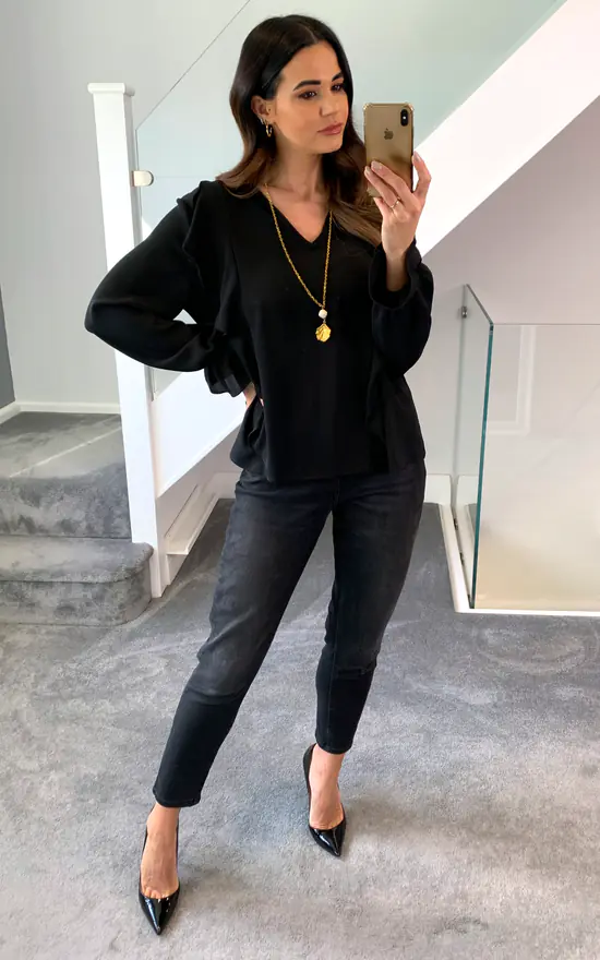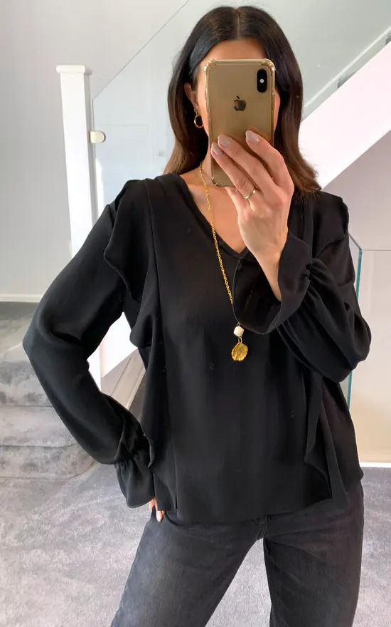 Oversized Ruffle Front Detailed V Neck Top with Necklace in Black will carry you from the work to the weddings. With its breathtaking ruffle details on front and elegant v-neck design, it will be your go-to top! It is comfy, classy and stylish. All occasions are a perfect fit for this blouse. You can dress it both with jeans and leather jacket, or with high heels!