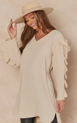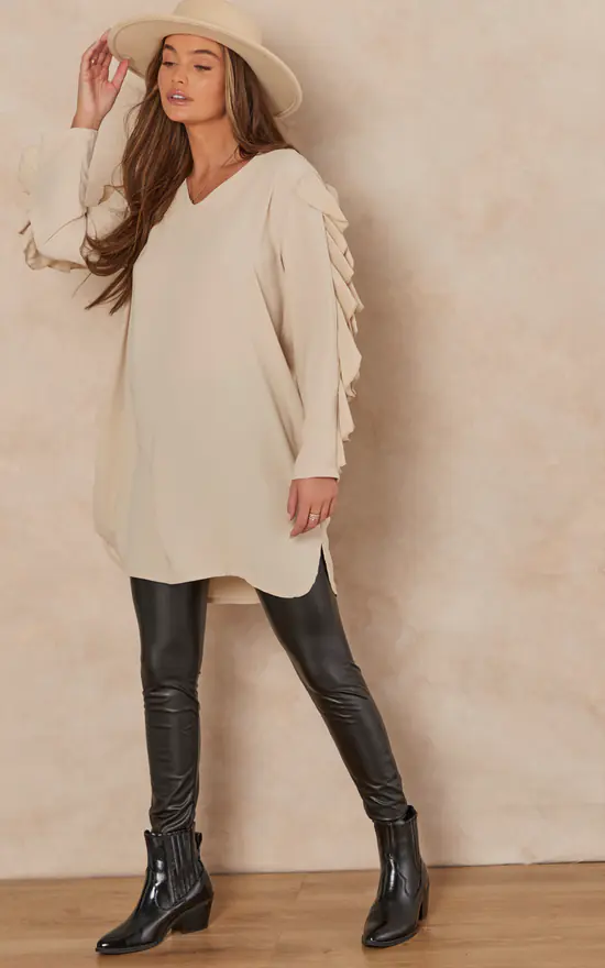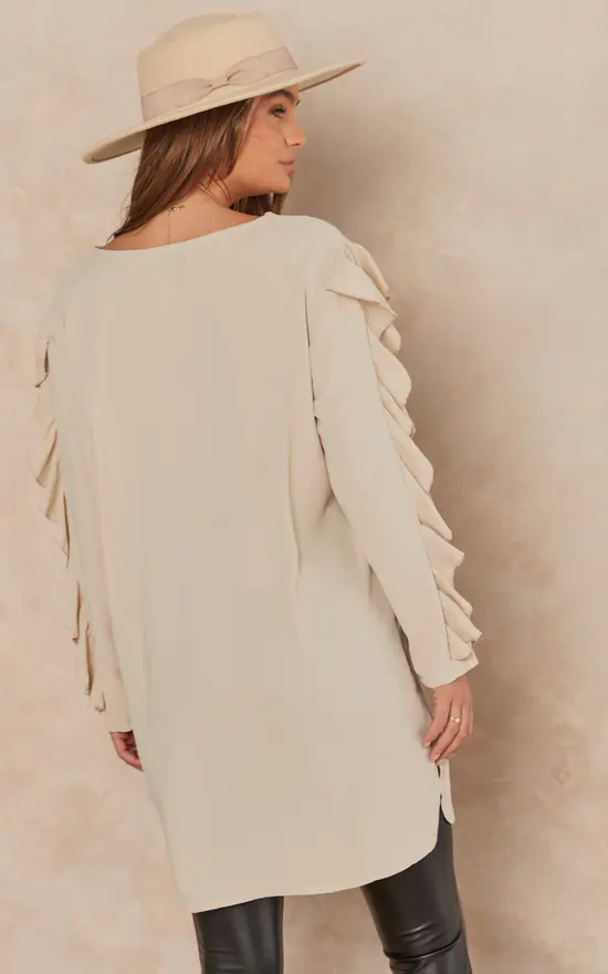 This trendy tunic is the perfect addition to your wardrobe. It features a v-neck, ruffle sleeves, and an oversized fit that is sure to turn heads.