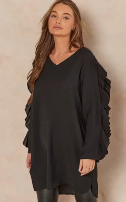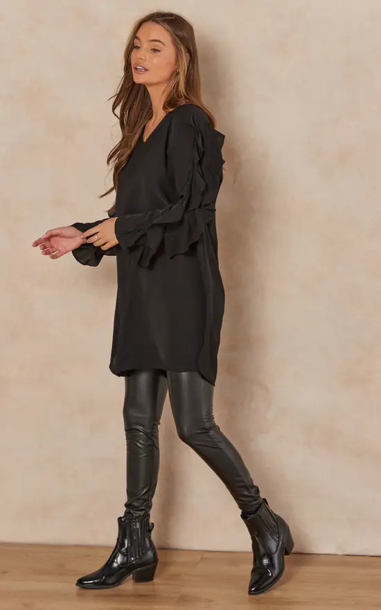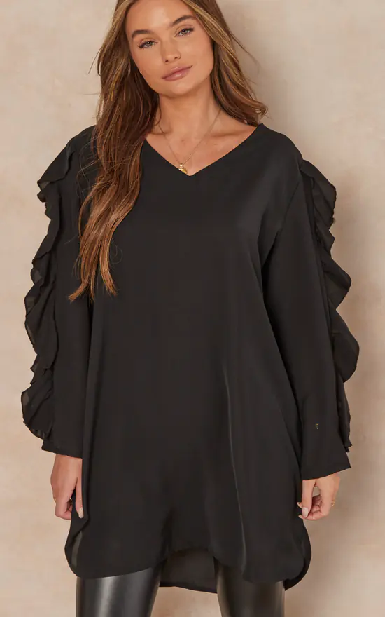 This trendy tunic is the perfect addition to your wardrobe. It features a v-neck, ruffle sleeves, and an oversized fit that is sure to turn heads.