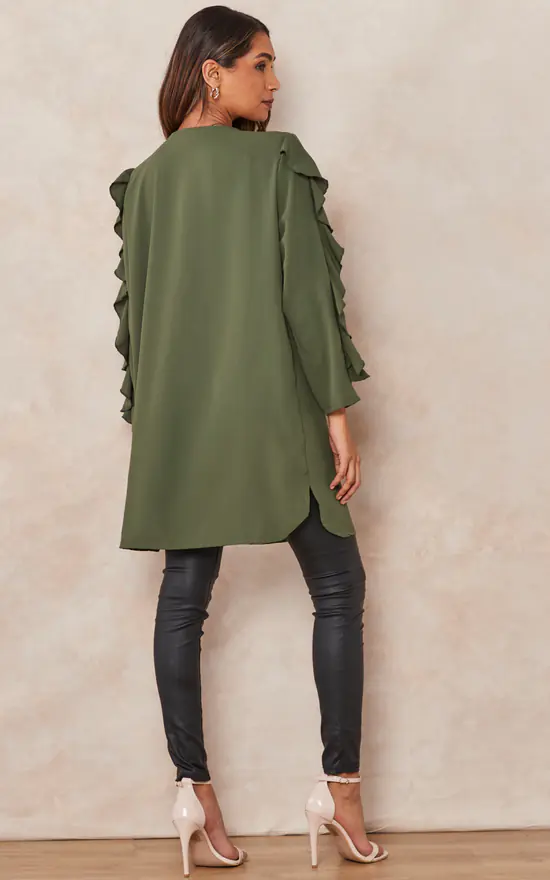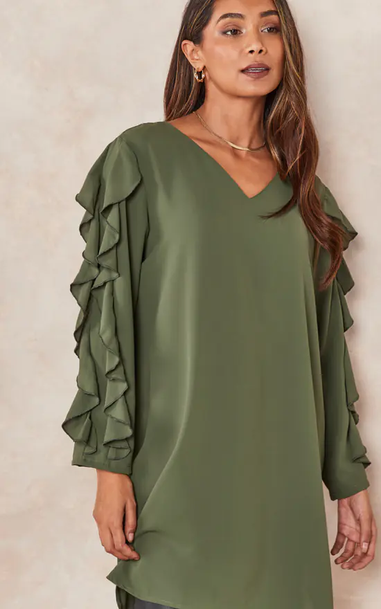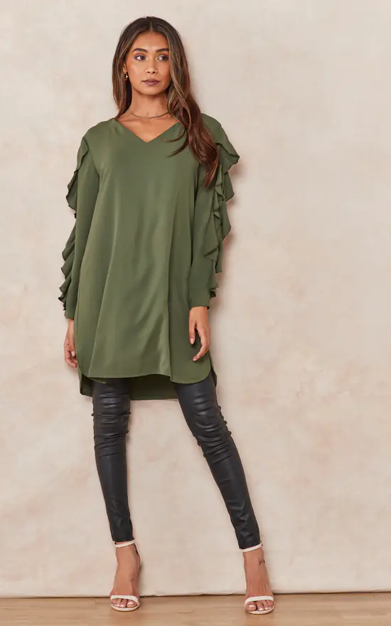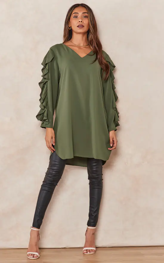 This trendy tunic is the perfect addition to your wardrobe. It features a v-neck, ruffle sleeves, and an oversized fit that is sure to turn heads.