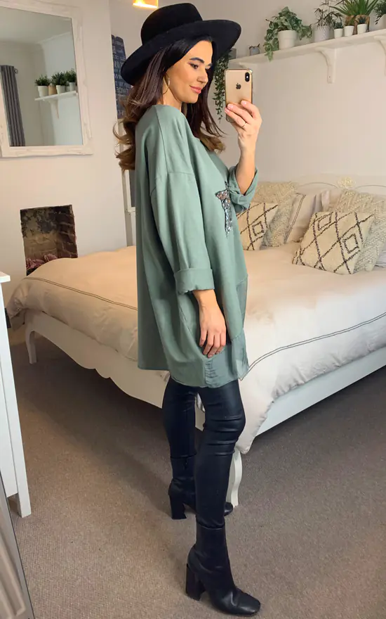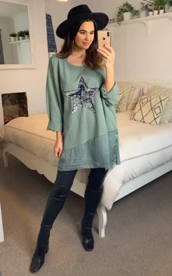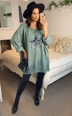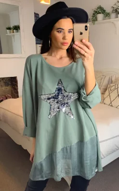 Oversized Star Print Sequin Top in Green