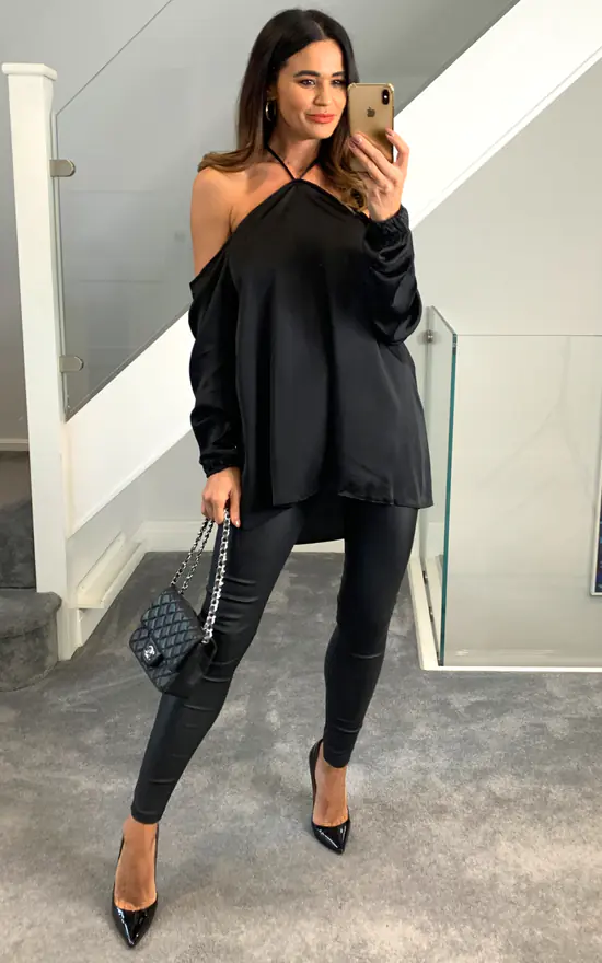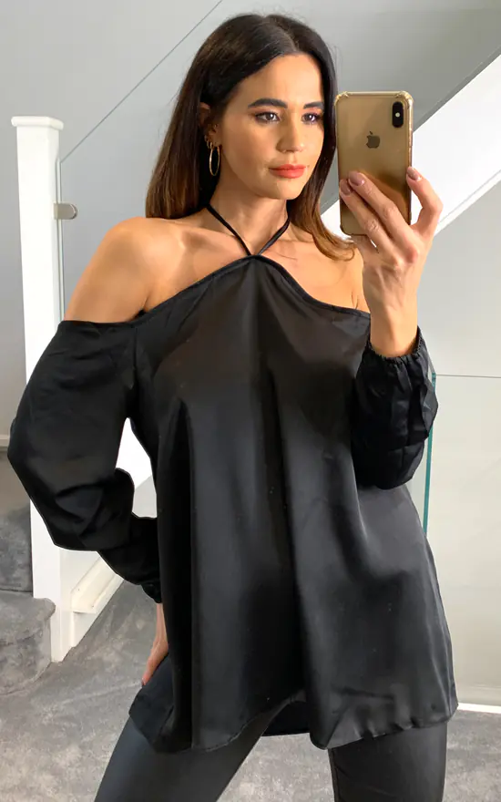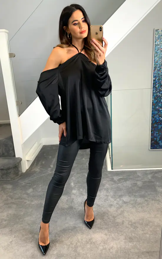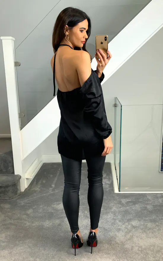 Oversized Tie Neck Off Shoulder Top in Black is very fashionable way for throw on and go! It can be very elegant for parties!