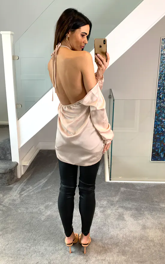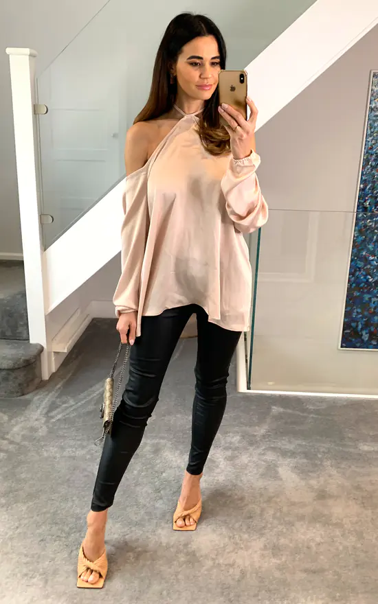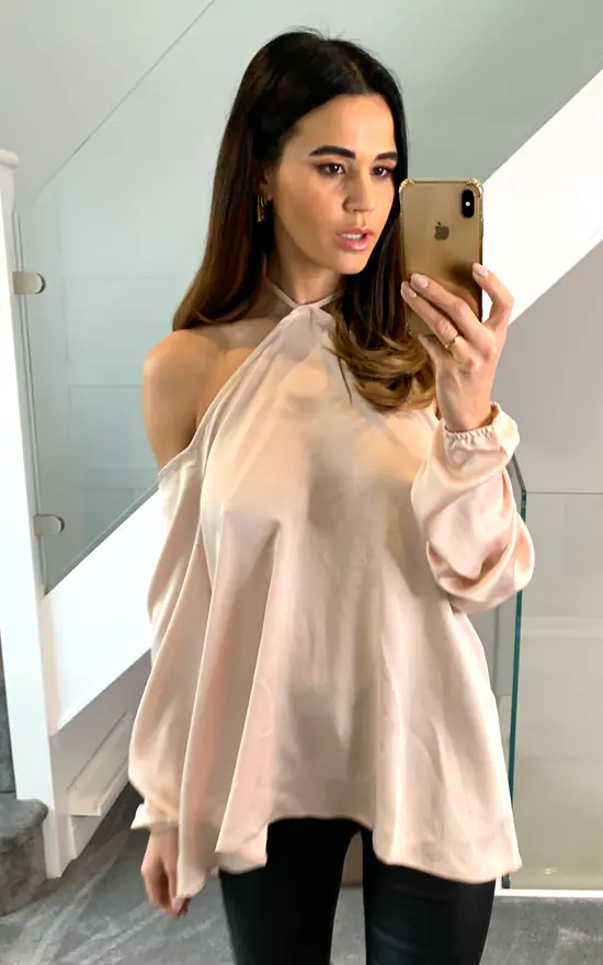 Oversized Tie Neck Off Shoulder Top in Cream is very fashionable way for throw on and go! It can be very elegant for night outs!