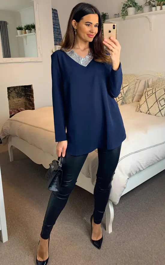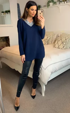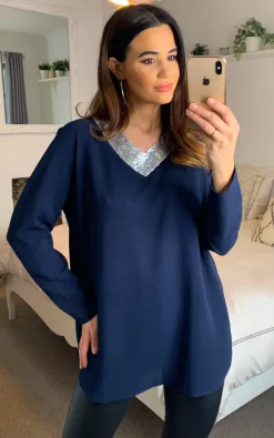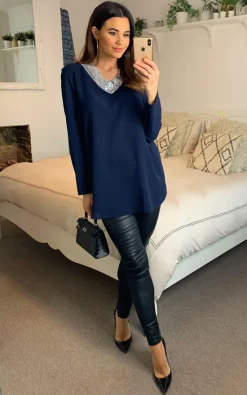 Oversized Top with Sequin Collar Details in Navy