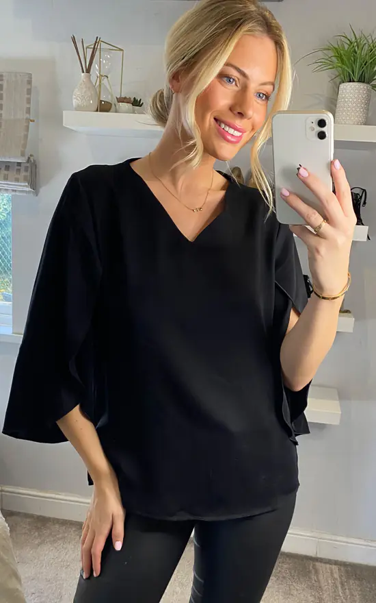 The look of elegance and charm with this blouse. Featuring a v-neck, detailed split sleeves, and a flowy silhouette. Dress up or down with jeans or a skirt!