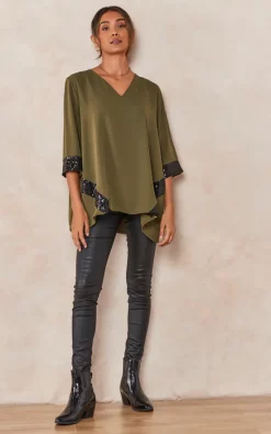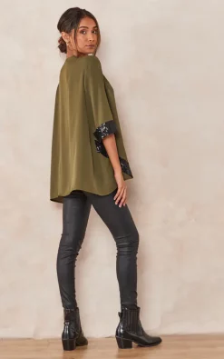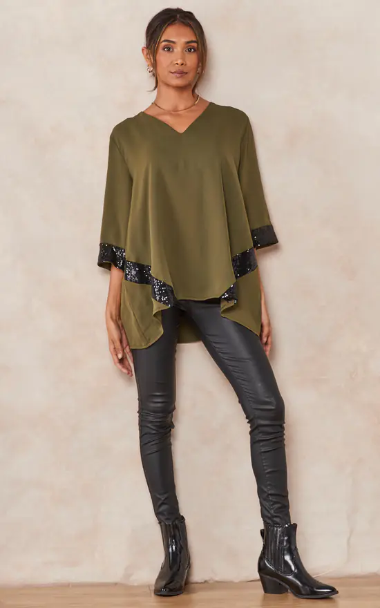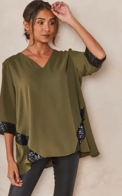 The Oversized V Neck Sequin Detailed Top with 3/4 Sleeves in Khaki is the perfect piece to dress up any outfit. The sequins add just the right amount of sparkle, while the v-neck and 3/4 sleeves give it a feminine touch.