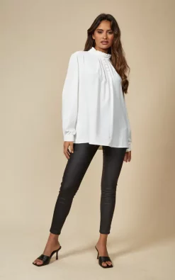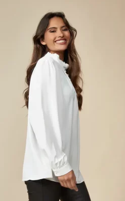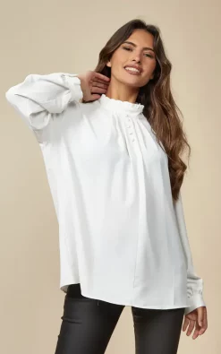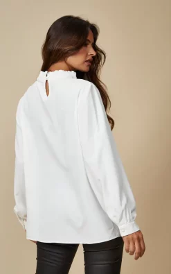 Relaxed Fit Long Sleeves Ruffle Neck Top with Button Details in White is a must have piece that can be combined in several different ways and must be in your wardrobe!