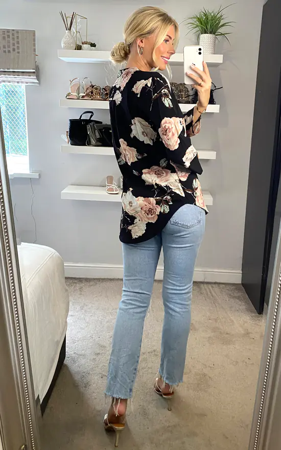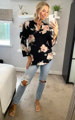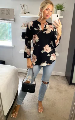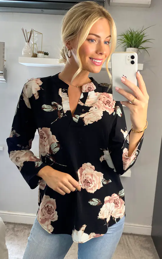 No closet is complete without a flattering floral blouse. With a v-neck collarless neckline, 3/4 sleeves with a tab to fasten when rolled, a curved hem and a hip length fit. Style with tailored trousers and heels for a chic weekday to weekend look.