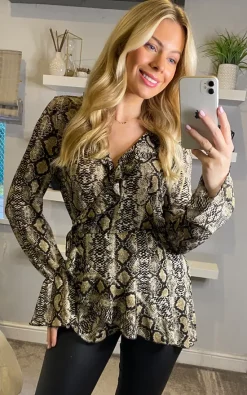 No closet is complete without a snake print blouse. With a v-neck, a faux wrap front, long flared sleeves and a frilled peplum shape. Style with cropped jeans and heeled ankle boots for a dressed up daytime outfit or pair with a fitted skirt and heels for a polished evening outfit.