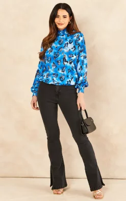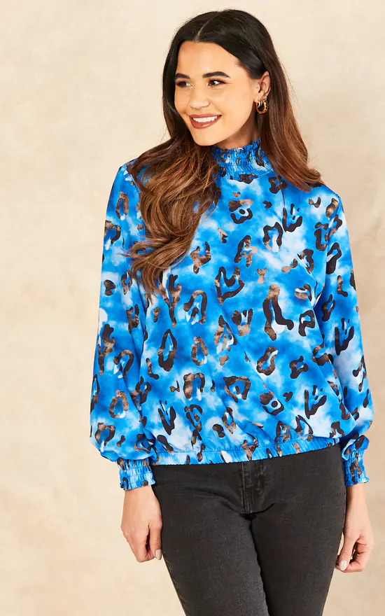 High Neck Oversized Top with Long Sleeves in Trendy Sax Blue Multi Leopard Animal Print.