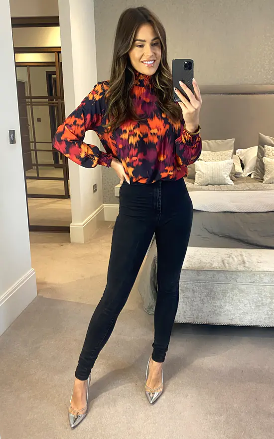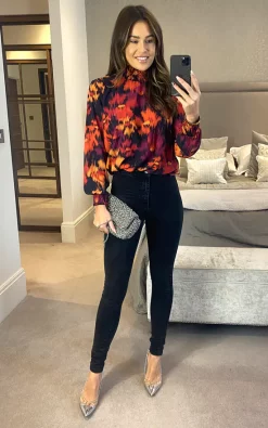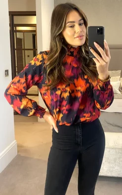 High Neck Oversize Top with Long Sleeves in Stylish Floral Print. Has elastic neck line, cuffs and hem.
