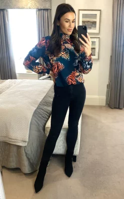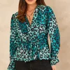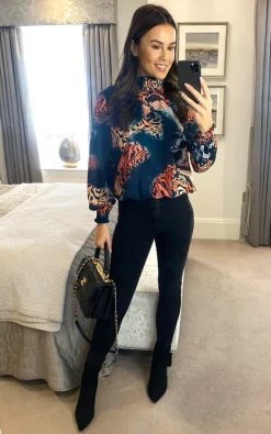 High Neck Oversize Top with Long Sleeves in Stylish Navy Animal Print. Has elastic neck line, cuffs and hem.