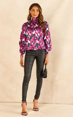 High Neck Long Sleeve Oversized Silky Top in Trendy Purple/Pink Geometrical Print.