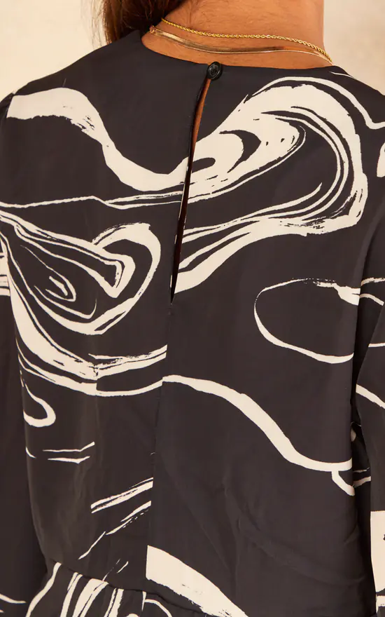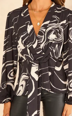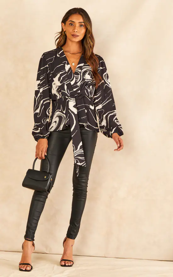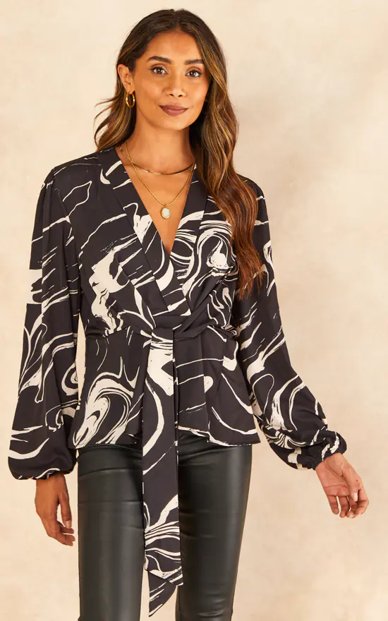 Long sleeve Wrap over Knot style Top / Blouse in Black/ Beige Abstract print.