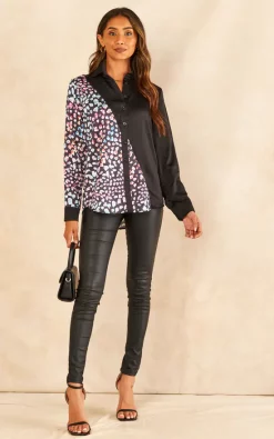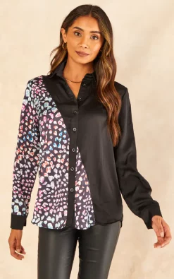 Long Sleeve Shirt in Stylish Colour Block Black/Blue Abstract Print. Buttoned at the front.
