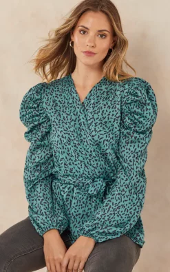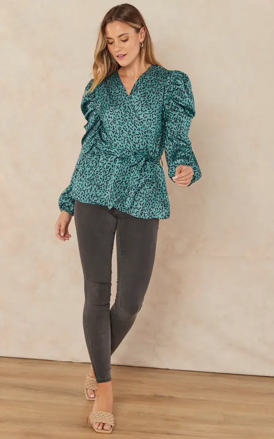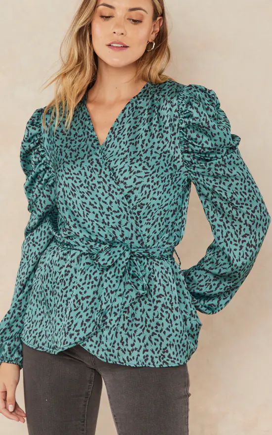 Long Sleeve wrap top in Green Mint abstract Polka Dot print. V neck Wrap blouse with belt has drape detail on shoulders and lastics on long sleeve cuffs. Fixed with the lastic on the waist as well for relax fitting.
